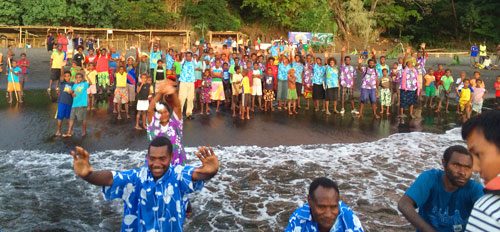 And the kids can’t get enough of the action. When the dancer squats low, flaring his legs, the women do the same. The kids, shy and sweet, laugh harder. Ours was the first cruise ship ever to land on their beach. Ever. The chief’s wife, Margaret, told me earlier that morning that her great grandfather had prophesized that something wonderful would one day happen here. They’d waited years. Then five months ago, they learned a ship—our ship—was coming. They began stitching together costumes and building the bamboo seats, showers and stalls to offer beer and soft drinks. Those from nearby islands and villages slept here for months to help provide manpower.